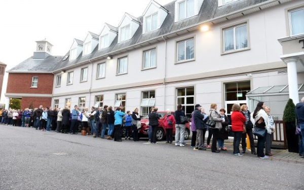 A large queue formed from early morning at the Carrigaline Court Hotel and due to an unprecedented demand, tickets were restricted to just two per person, for the 1,000 seater venue, with 700 going on sale to the public on Saturday.