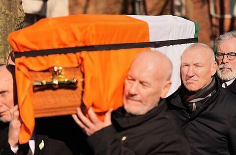 Mr Adams was among those who took a turn at carrying McFarlane’s coffin, which was draped with an Irish flag, along the Cliftonville Road before it was transported by hearse to Milltown Cemetery in west Belfast.