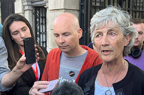 Irish presidential candidate Catherine Connolly (centre) attends a demonstration with opposition politicians outside Leinster House Dublin, in support of Oireachtas Broadcast workers (Cillian Sherlock/PA)