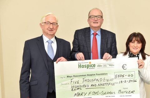 Seamus Butler, and Mary Foye making a presentation of a cheque for €5,895 to Mike Smith, director - Mayo Roscommon Hospice Foundation, following a fundraiser for the Sunflower Children’s Hospice at the Four Provinces, Rathallen, Boyle. Pic: Enda Regan