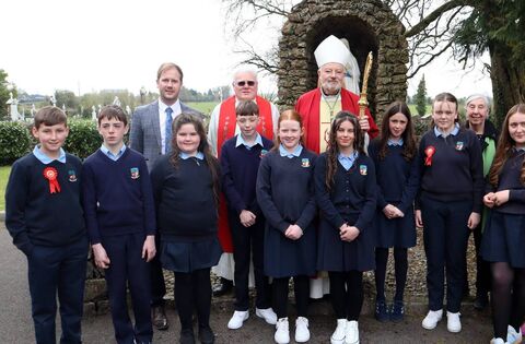 Bishop Kevin Doran and Fr Micheal Donnelly with teachers and pupils from Frenchpark NS following Confirmation last week. Pic: Liam Reynolds