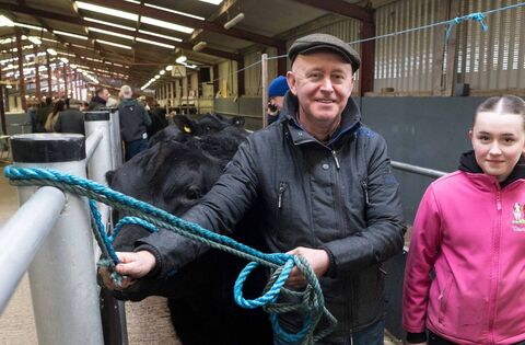 John and Amy Heneghan from Ballinlough head to the ring with Jackie Adam. The Angus bull went on to sell for €4,300 at a sale of pedigree bulls and heifers at Carrick Showgrounds. Pic: Gerry Faughnan