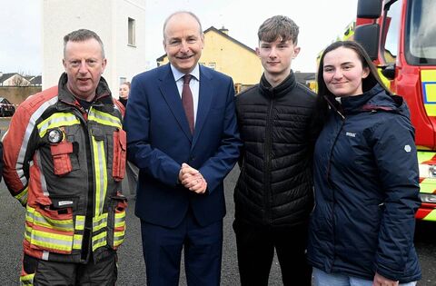 Micheál, Jamie and Molly Frain with Taoiseach Micheál Martin in Ballaghaderreen last week during a visit by the Taoiseach in the wake of Storm Éowyn. Pic: Gerard O’Loughlin