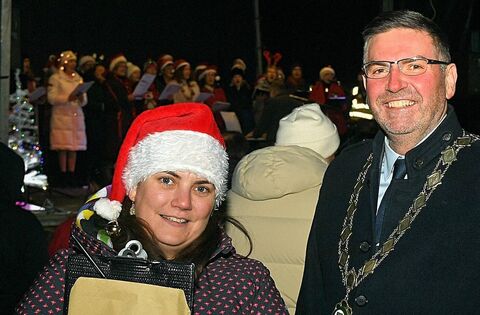 Kelly Marie Neary, Monksland Town Team and Cathaoirleach of Roscommon County Council, Cllr John Keogh, pictured at the switching on of the Christmas Lights in Monksland. Pic. Gerard O’Loughlin