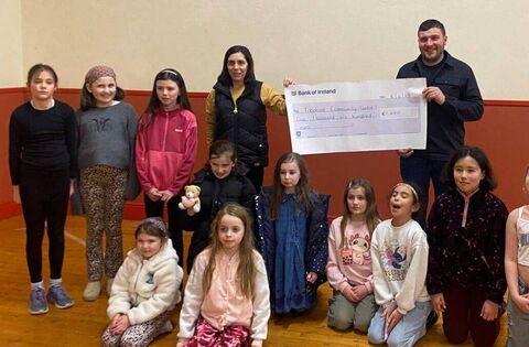 Mary Lynskey, principal of Tibohine NS, presents a cheque for €1,600 from the recent Tractors and Tea fundraiser to the chairperson of Tibohine Community Centre Liam Mahon. Also pictured are pupils of the drama class in Tibohine Community Centre. Pic: Breda Durr