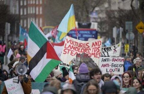 Palestinian flags, Irish flags and trade union banners were among items carried by the crowd, which gathered at Parnell Square, before marching across the city centre to Merrion Square.