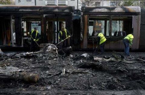 A clean-up operation is now under way after the disorder, with burned-out Luas tram carriages lifted off the track by cranes and broken glass and missiles swept off the streets.