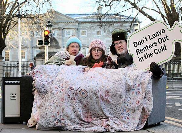 The evocative photostunt took place on Kildare Street on the footpath outside Dáil Éireann on Thursday to highlight the plight of renters, who are paying extortionate rent while being forced to live in sub-standard, under-insulated homes, due to the lack of any basic energy efficiency standards for rented accommodation.
