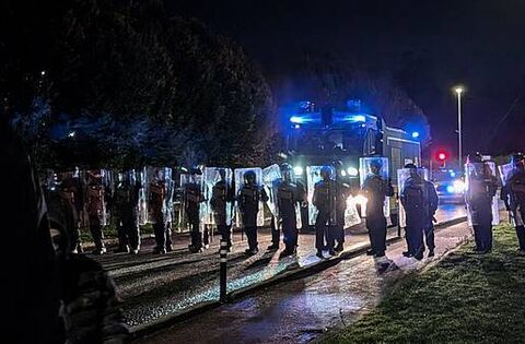 During the earlier disturbances, a large crowd remained in the area until late in the night and public order officers with shields, and some on horseback, moved protesters back.