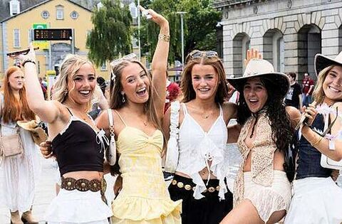 From left: Misha Magee, Lauren Kilbride, Grace Dowling, Maria Grassick and Sophie Kelly from Naas arrive ahead of the Zach Bryan concert in the Phoenix Park, Dublin. Photo: Sam Boal/Collins