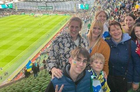 At the Republic of Ireland v Ukraine match in the Aviva Stadium: Oleksyii, Arlo, Angie, Natalya, Oleksandra, Edie, Oisín, Taya and Mariia.