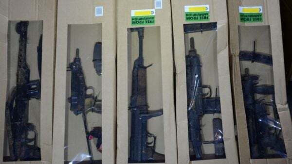 They contained seven machine guns, three automatic hand guns, an assault rifle and ammunition.