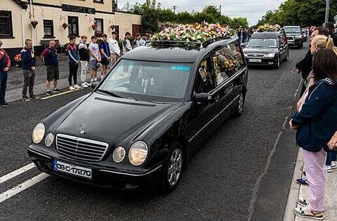 Many of the mourners wore GAA jerseys and bright colours as requested by the family as they lined the main street to watch the three hearses pass by.