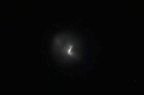 The bright light was said to be caused by the process of excess rocket fuel being ejected and freezing, then reflecting light back to earth.