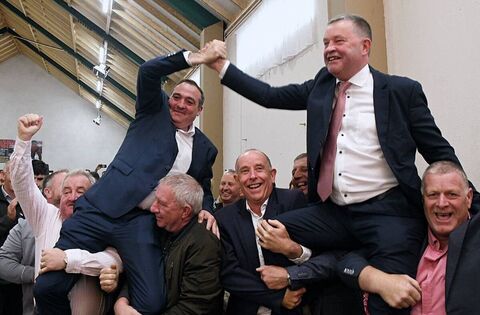 Cllr Paschal Fitzmaurice, right, will become the new Cathaoirleach of Roscommon County Council. He is pictured here at the count centre after being re-elected alongside party colleague, Cllr Marty McDermott. Pic. Gerard O'Loughlin