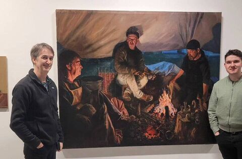 Conor O'Connell with his award-winning painting 'umha aois' at the Royal Hibernian Academy of Arts. Also in the picture is artist James Hayes who appears in Conor's painting.