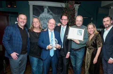 Boyle native Hilary Beirne was honoured by the Irish Business Organisation of New York when he was presented with the 2024 Sean McNeill Award. Picture shows Peter O'Neill, Membership Director; Colleen Berry Conway, Director of Operations; Hilary Beirne; Seán O'Dowd, First Vice-President; Paul Finnegan, President; Maura Clare, Second Vice-President, and Gareth Hargadon, Deputy Consul General, Consulate General of Ireland in New York.