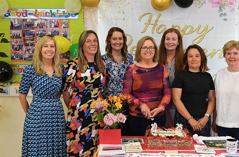 Colette Brennan, principal of Kilteevan NS (centre), cutting a cake to mark her retirement from the teaching profession after 26 dedicated years of service at Kilteevan NS. She is pictured here with staff members from left: Michelle Whyte, Rachel Dunphy, Susan O’Connor, Claire Lynch, Vicky Nolan and Lena Coyle. Pic: Gerard O’Loughlin