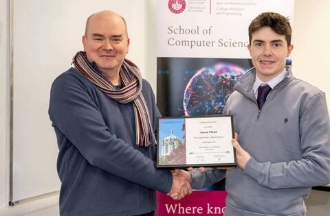 To acknowledge this achievement, Aaron was presented with his award by Dr Aaron Golden, Vice-Dean for Research and Innovation, College of Science and Engineering, University of Galway, at the School of Computer Science Awards Day.