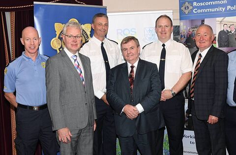 Inspector Dave Tiernan; Shane Tiernan, CEO Roscommon County Council; Chief Supt. Ray McMahon; Cllr. Tom Crosby, Chairperson Roscommon JPC; Supt. John Fitzgerald; Det. Inspector John Costello and Inspector David Cryan pictured at a Roscommon JPC meeting in the Abbey Hotel. Pic. Gerard O’Loughlin