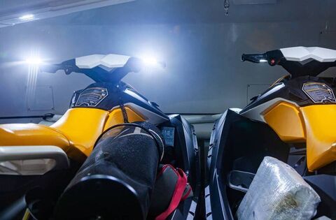 The ‘Sea-Doo’ brand jet skis are yellow with black trimming.