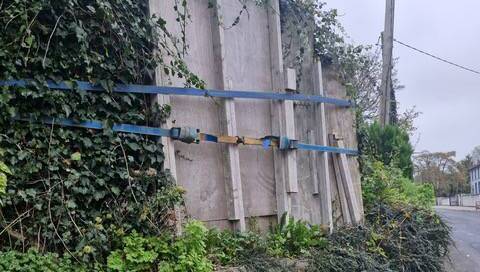 “And the gable of it is falling out into the road,” he said. He added that it is surrounded by pallets and held together with ratchet straps.