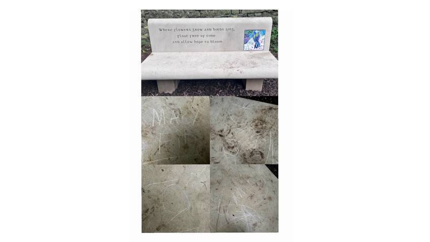 The memorial bench pictured at the top. Below are areas of the seating section which have been defaced in a number of areas with scrawled, scratched writing.