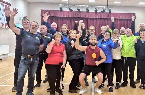 Ireland AM presenter Deric Ó h'Artagáin with Laura Tully and Fit Farmers participants in Moore Community Hall recently.