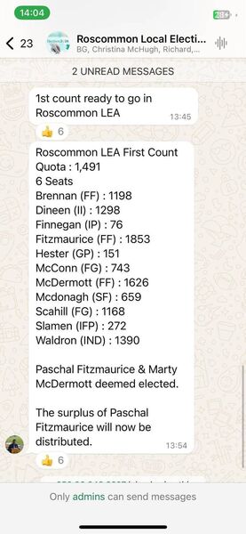 Paschal Fitzmaurice, who topped the poll in 2019, achieved 1853 first preference votes while McDermott received 1626. The two men were hoisted high by members of the large crowd at the count centre at the Hyde in Roscommon.