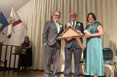 The 2024 Grand Marshal of the San Francisco St. Patrick’s Day Parade, Tom Hunt (centre) with his wife Mary and United Irish Societies President Liam Frost at the Grand Marshal Dinner where Tom was honoured.