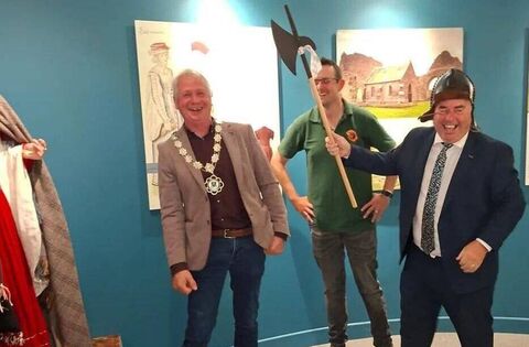 FOR THE AXE! Minister Moran and Cllr Callaghan at Rathcroghan Visitor Centre. Also pictured is Dr. Daniel Curley. Centre Manager.