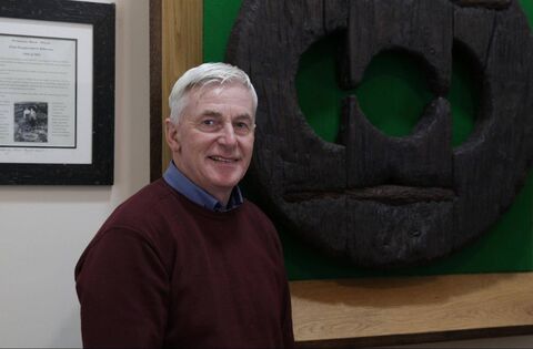 Sean Mooney in front of the replica of the chariot wooden wheel discovered by his late father and uncle in Doogarymore in 1969. The wheel itself is on display in National Museum. Pic: Stephen Crilly