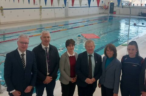 Shane Tiernan, Chief Executive, Roscommon County Council; Cllrs Nigel Dineen, Kathleen Shanagher, Tony Waldron and Orla Leyden; Sharon Ryan, Manager, Roscommon Leisure Centre and Sean Mullarkey, Head of Finance, Roscommon County Council at Roscommon Swimming Pool.