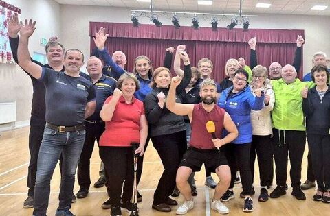 Ireland AM presenter Deric Ó h'Artagáin in Moore Community Hall with Laura and some members of the Fit Farmers programme.
