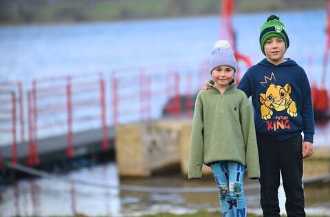 Olivia and James McHugh, Brideswell, pictured on the site owned by their late grandfather Colm Mee as the Interim Flood Relief Scheme for Lough Funshinagh became operational on Friday, March 28th.