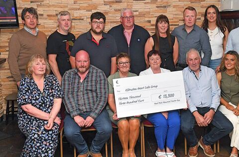 Kiltrustan Heart Safe was presented with a cheque for €13,300 at the Silver Eel Bar & Restaurant. In the picture are the tractor run committee members from left, front: Margaret Kelly, John Doorley (Patricia Rogers and Orla Regan Kiltrustan Heart Safe Group), John Lawe and Chloe Rogers. Back row, from left: Tony Beirne, Paul Kelly, Fergal Kelly, Martin Shiel, Fionnuala Lawe, Ben Kelly, Lauren Beirne and Conor Beirne. Pic: Gerard O’Loughlin