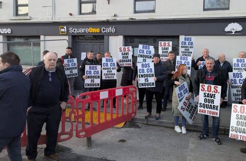 Members of the business community, holding placards, “SOS. Save our Square and Town” and "Hands off our carpark spaces", held the demonstration in The Square at 7.a.m..