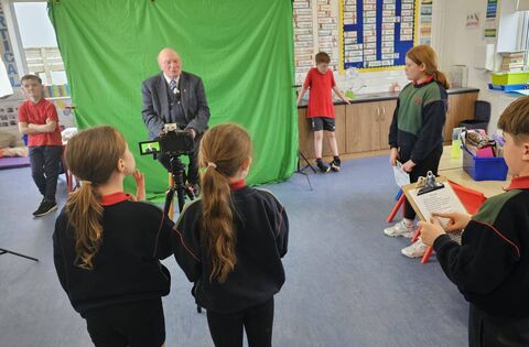 Deacon Willie Gacquin is interviewed by children from Curraghboy NS.