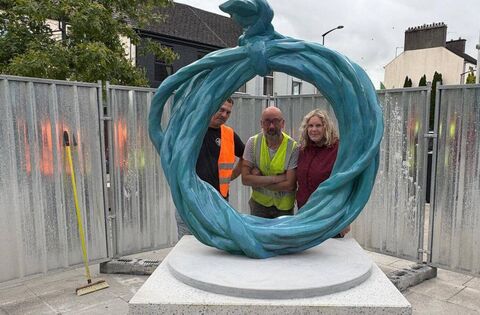 Colin O'Tool with artists Simon Carman and Dr. Helen Sharp at the new sculpture on the Market Square in Roscommon Town.