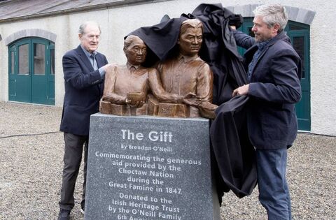 A life-size bronze sculpture titled 'The Gift', which commemorates the generous aid provided by the Choctaw Nation to Ireland during the Famine has been unveiled outside the National Famine Museum at Strokestown Park.