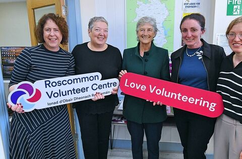 Áine Egan, Angela Gavigan, Eileen Stephens, Katie Kelly, staff at Roscommon Volunteer Centre with Catherine Connolly during her visit to Roscommon Town today. Pic: Gerard O'Loughlin