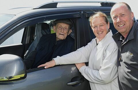 The 99-year-old is pictured here with his daughter-in-law Angela and son Mark at the Irish National Sheepdog Trials held recently on the lands of Barra O'Brien in Lisbrock, Brideswell.