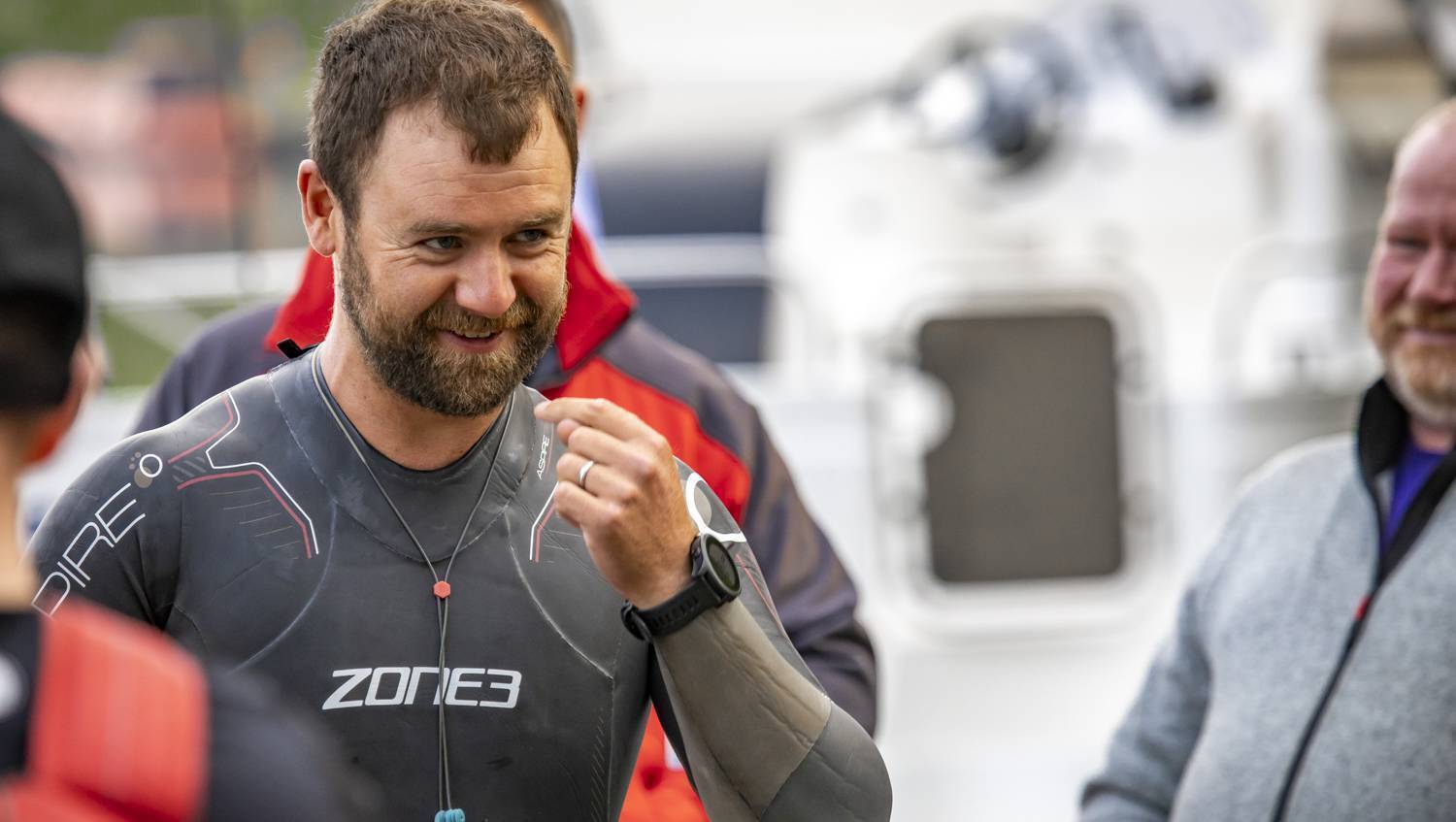 Paul Little getting ready to start the next leg of his swim at Roosky.