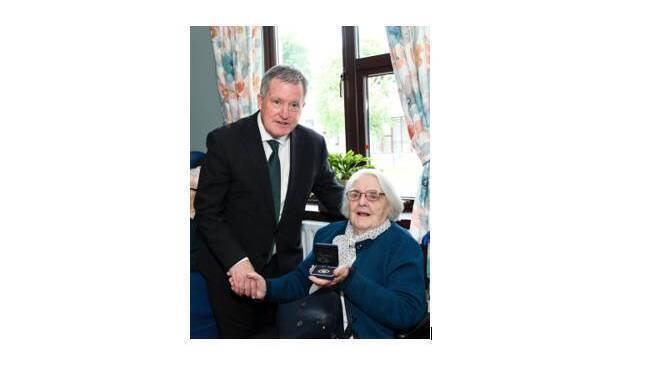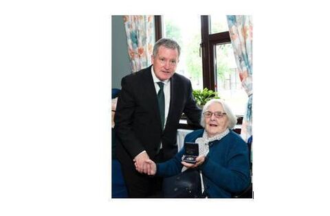 Pictured at the launch of a Community Linkage Project, a new initiative bringing community supports to women in nursing homes, are Minister of State for Older People and Housing, Kieran O'Donnell with Eileen Cox, resident, Plunkett Community Nursing Unit, Boyle holding her medal from the President for her 100th birthday. Eileen recently celebrated her 101st birthday. Pic: Ivan Keany