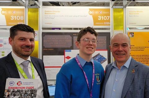 Coláiste Chiaráin student Seán Canny pictured with Deputy Denis Naughten and Michael Flynn (BT) at the 2024 BT Young Scientist & Technology Exhibition taking place in the RDS this week.