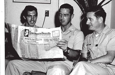 The film delves into the unexpected reunion of three Boyle men on the front page of the Roscommon Herald in 1972 when they were serving in Vietnam. Pictured L to R: Sgt. Gerry Duignan, a native of Ardcarne, Boyle; Capt. Paddy Feely, late of Abbeytown, Boyle, and Sgt. Michael Noone, Cornagrea, Ballyfarnon.