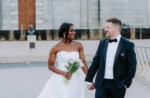 Former Clann na nGael player Niall McManus with his bride, Ebi Brambaifa McManus, on their wedding day. Picture: Clann na nGael