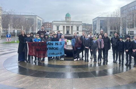 Pupils from Fourth, Fifth and Sixth Class at Kilcroan NS, Ballymoe with class teacher Ms Michelle Fallon, SNA Mrs Marie Duignan principal Mr Cian Boyle at the department of Education for the presentation of prizes in an All-Island History Competition.