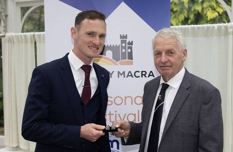 Kevin Crehan from South Roscommon Macra represented Roscommon at the festival. Also attached is Kevin receiving a set of cufflinks from Geroge Hatton of Kilkenny/Carlow and District Farm Refief Services.