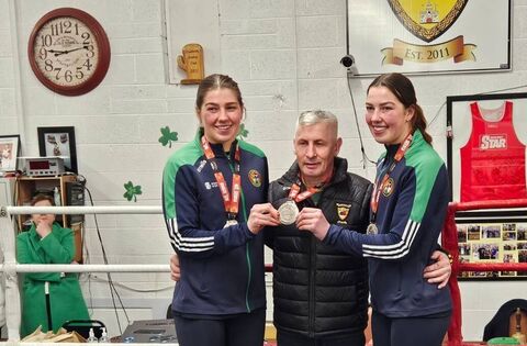 Castlerea sisters Aoife and Lisa O’Rourke returned home tonight, Monday, proudly displaying their silver medals and were given a rousing reception at the town's boxing club. They also had a special presentation for boxing club coach Paddy Sharkey.